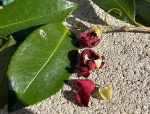 そんなダノに、園内でサザンカが咲いていたのでプレゼントしてみました。すると、最初は匂いを嗅ぐだけでなかなか食べませんでした。そこで、いつものエサ箱にサザンカの蕾を追加して様子を見ることにしました。すると、翌日には食べた形跡を発見!さらに次の日には、サザンカの花を食べている姿も確認できました。ムササビは、植物の葉や花、蕾など様々な部分を食べます。ダノは、花や蕾を食べましたが、その食べ方に特徴がありました。特に食べ残された蕾をよく観察してみると、割って中の部分だけ食べていました。将来種子になる「子房」の部分がきれいになくなっており、この部分は栄養価が高いと考えられています。ダノは、全て食べるのではなく栄養のある部分をしっかり選んで食べているのですね。