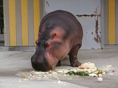 英名のHippopotamusは、ギリシャ語のHippo(馬)potamus(河)を合わせた言葉です。日本名はこれを直訳し河馬(カバ)と呼ぶようになりました。生息地はアフリカの北部を除く河や湖に生息し、夜間は水辺から出て草原で草を食べます。野生では数頭から多くなると数十頭の群を作ります。水中生活が長いため魚を食べていると思われがちですが、完全なベジタリアン(草食)です。体重は大人のオスで2トンから3.2トン、メスは2トン前後だと言われています。寿命は野生で45年、飼育下で50年ほどです。体の部位も水中生活に適応した進化をしていて、耳も水が入ってもプルプルと振って水を出すことができます。また、特徴的なことは目、鼻、耳が顔の上部で一直線に並んでいるのです。これにより顔の一部を出すだけで周りの状況を確認し、呼吸をすることができます。また、5分ほど水に潜ることができます。オスの特徴としては、短いしっぽで糞をとばして臭い付けをしてなわばりを示します。メスの妊娠期間は約240日で通常一頭の子を生みます。交尾、出産、授乳の多くを水中で行う珍しい哺乳類です。水中では泳ぐのではなく、水の底を歩いて移動します。