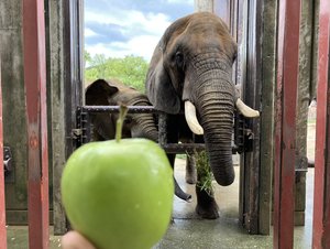 毎日の日課となっているゾウたちのトレーニングの時間。ゾウたちの肢のケアをしたり、健康管理のための新しい動作を覚えてもらうトレーニングの時は、いつもゾウたちが好きなリンゴをごほうびとして与えています。