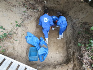 これまでアフの亡骸はゾウ舎裏の敷地に埋めていましたが、死亡から約5年が経ち、これからはアフリカゾウの貴重な骨の標本として役に立ってもらう予定です。5年前は重機で穴を掘りましたが、今回は骨を傷つけることがないようにスコップで手掘りをしています。埋葬した時に記録した写真で位置を確認しながら、数人で協力して掘っていますが、かなり深い所に埋めているため、全部の骨を回収するにはまだ時間がかかりそうです。