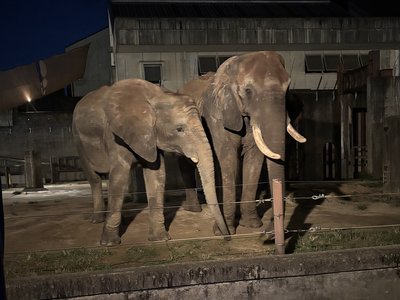 8月の毎週土曜日には、夜の動物園を開催しました。普段は15時45分に寝室に移動し、それから朝までのんびりと過ごしていますが、夜の動物園開催日は20時10分まで外の運動場で過ごしています。アフリカゾウたちに与える1日のエサの量は決まっており、運動場で採食するエサの量を調節しながら給餌回数を多くします。しかし、遅い時間になるとお腹がすいてきて、3頭ともソワソワし、普段とは違うテンションになっていることもしばしば…。寝室へ移動する作業をする際には、ゾウがどのような動きをするのか分からないため、普段以上の注意が必要になっています。