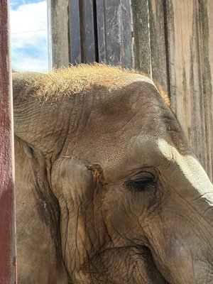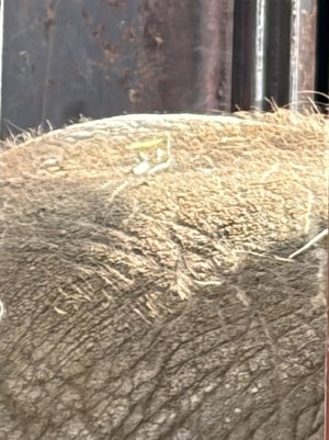 皆さんはアフリカゾウの毛を意識して見たことはありますか?普段はモート(空堀)越しに少し離れた場所からの観察となるので、ゾウの体の細かいところまでは見にくいかもしれませんが、その中で分かりやすいのは、長いまつげとしっぽに生えている太い毛です。さらによく見てみると実は体全体に毛が生えているのが分かります。特に日の光で透されると毛の1本1本が見やすくなります。動物園に来た時はぜひ、ゾウの毛までじっくりと観察してみてください。