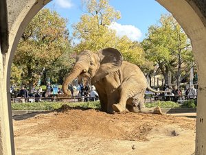 久しぶりに、アフリカゾウ舎の運動場に真砂土を2tトラックで2台分搬入しました。ただ入れるのではなく、運動場の中心に小さな山を作るように入れています。こうすることにより、ただの土が立派な遊具に大変身!土の山に寝転んだり、足で穴を掘ったり、牙で土を掘り起こしたり…泥だらけになりながら様々な遊びを見せてくれます。時には地面に逆立ちでゾウが突き刺さっているようにも見えることも…(笑)。夢中で遊ぶことが、ゾウたちのストレス解消にも役立っているようです。楽しそうに土遊びしている姿をぜひ見に来てくださいね。