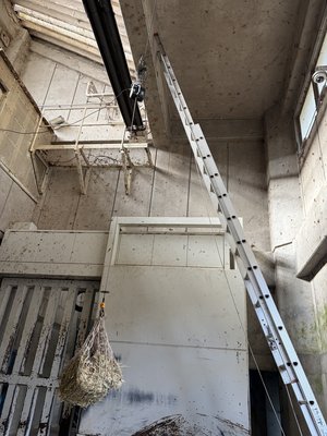 ゾウキーパー奮闘記おなじみの高所作業。長いハシゴを使って電動ウインチにリモコンの線を接続します。おかげで再び動くようになりましたが、操作のたびに2階にあるリモコンのところまで行かないといけなくなりました。はたして楽なのか楽じゃないのか。