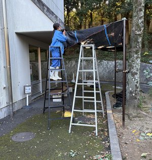 前回は支柱として木を使用していましたが、雨風で腐食してしまうため、今回は金属製の単管を使用して作りました。景観を損なわないようにペンキで塗装し、サイズも前回より大きくしました。単管は「ショウセン」という道具で穴を彫って地面に深く埋め込み、これに寒冷紗を取り付けました。これで影ができてガラスの反射が少なくなり、部屋にいるゾウが見やすくなりました。動物だけでなく、来園者の方にも喜んでもらえるように工夫をしています。