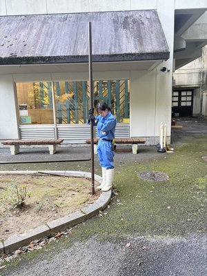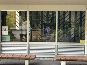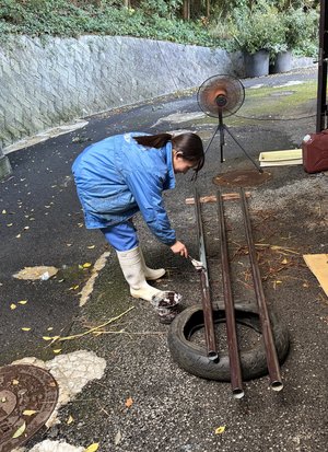 皆さんは、アフリカゾウたちが室内で過ごしている様子を見たことがありますか?実は媛の寝室は壁の一部がガラス張りになっており、室内でトレーニングをしている様子やエサを食べている姿が観察できるようになっています。このガラスは外が明るいと風景などが反射してしまうため、周りに映り込み防止のために寒冷紗(夏に日除けとして使用し破損したものを再利用しています)を設置していました。しかし寒冷紗と支えている柱が古くなっていたので、今回新しく作り直すことにしました。