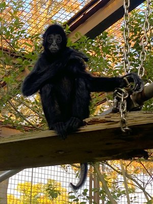 コロンビアクロクモザルのクロ(♀)の続報です。夏に体調を崩し、バックヤードで過ごしていたクロですが、体調が安定したためクモザル舎に戻りました。戻った後も経過が良好だったため、約3カ月ぶりに放飼場へ出すことができました。久々の放飼場を隅から隅まで探索し、元気いっぱいに過ごしていました!クロの様子を見て、心配していた職員みんなでホッと一安心でした。この日は念のため早めに寝室に戻ってもらう予定でしたが、まだまだ帰りたくなかったのか、すぐには戻ってこず夕方までしっかり屋外を満喫していました。