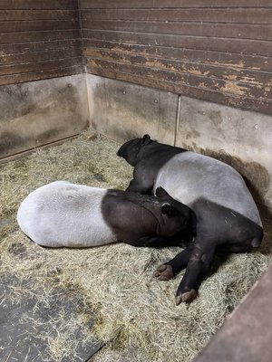 とべ動物園開園以来初めて誕生したマレーバクのヒメナは、元気にすくすく成長しています。現在推定体重は130~140㎏程となり体は大きくなりましたが、お母さんのナナハのおっぱいを毎日飲んでるのでまだまだ仔どもです。授乳回数は減ってはいますが、ナナハもヒメナが飲みたいという合図をすればゴロンと横になってやります。この光景が冬のマレーバク舎内での姿となっています。