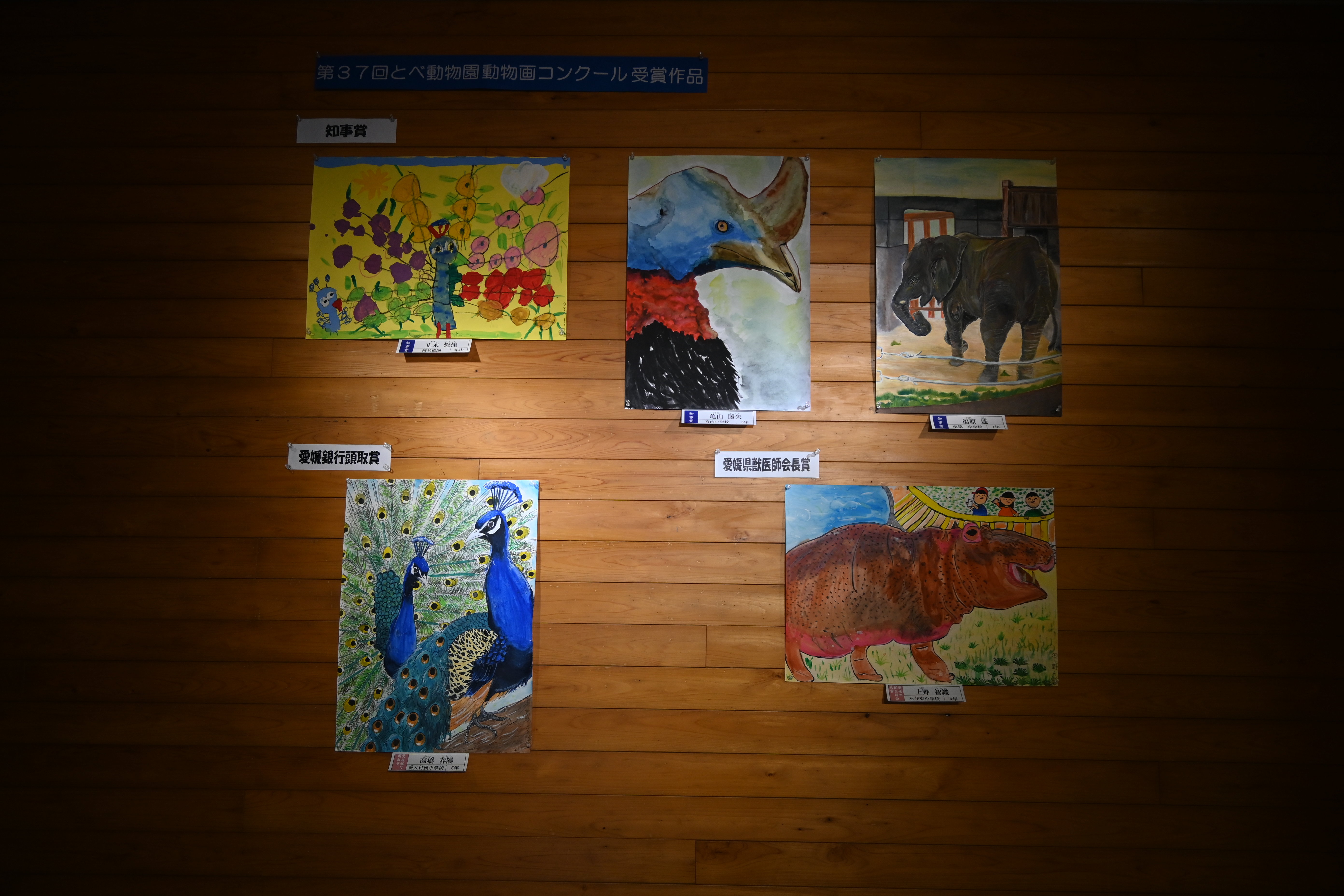 とべ動物園では毎年8月に、動物画を募集しています。今年は県内外から354点の応募がありました。厳正なる審査の上、力作ぞろいの中から選ばれた入賞作品38点を展示しています。どうぞごゆっくりご覧ください。
