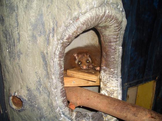 この度、一時入院していたムササビがスネークハウスの夜行獣舎に戻ってきました。退院日に確かに寝室に戻したのですが、数日後、清掃や餌の時間にムササビの姿がありません。慌てて寝室内を隈なく探し、ムササビがよく入っている大きな洞の中も入念に見てみましたが、どこにも姿がありません。「居るはずの動物がいない」と途方に暮れながら、何となくスマホで洞の内部の写真を撮ってみると、なんと洞の底の方、ちょうど人の目では見えない位置にムササビの姿が写っていたのです。洞は底に入って行けないような工夫をしていましたが、どうやらわずかな隙間を抜けてしまったようです。姿を見つけてホッと一安心ですが、できれば「目の届く」場所で遊び回る姿を見せてほしいものです。久しぶりに戻った我が家、色々散策してみたかったのかもしれませんが、担当としてはヒヤリとするので、「も~、いいか~い」のかくれんぼは今回限りでお終いにしてほしいです。