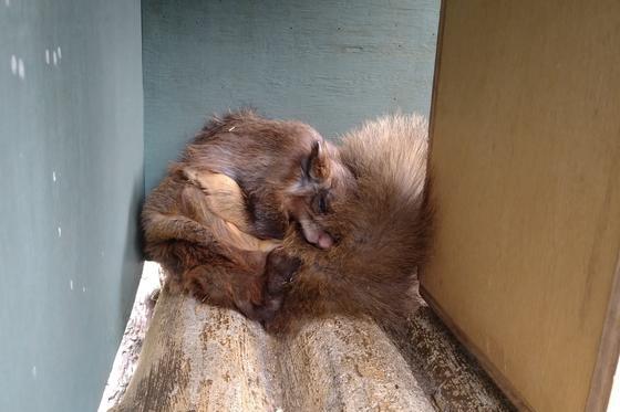 保護鳥獣舎で飼育しているムササビたち。毎年、夜の動物園の時には縦横無尽に駆け回って、来園者のみなさまに姿を見せているのですが、日中は巣箱の中に入って休息しています。以前、当園のXでご紹介しましたが、暑い夏の時期は、1頭は巣箱近くの日陰などで休んでいることが多いです。暑い中、2頭で巣箱の中で重なって過ごすのは確かに辛いですよね…。