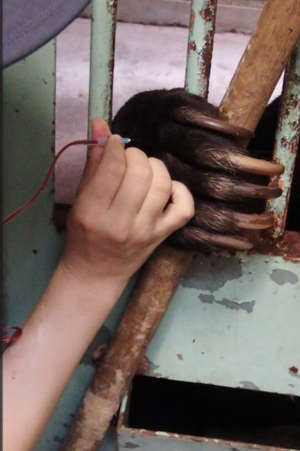 まず、マレーグマのシャイン(♂)。前肢の手の甲にあたる部分にある血管から採血を行います(画像①)。血管を目視、触知することが難しいため、骨の位置を確認して針を刺します。採血の間、シャインはオレンジジュースに夢中です。