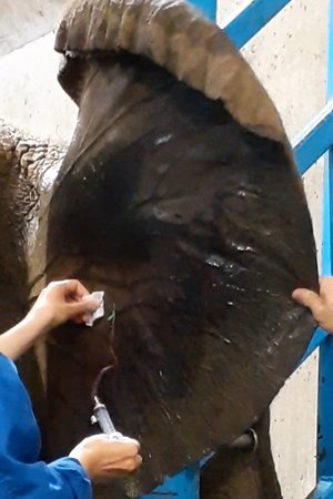 次に、アフリカゾウの砥愛(♀)。耳の裏にある血管から採血を行います(画像②)。気温が高い日は、血管が拡張して採血も行いやすいのですが、気温が下がると血管が収縮してしまい、採血が難しくなります。そのようなときは、お湯を耳の裏にかけて、血管を拡張させてから採血を行います。