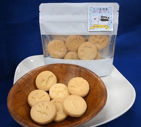 とべ動物園が所有している動物足あとデータを弓削商船の学生さんが3Dデータ化し、就労継続支援A型事業所パイ専門店Tsutsumiさんがそのデータを基にクッキーを製作してくれました。クッキーには愛媛県産の米粉(協力:愛媛大学附属高等学校)が使用されています。